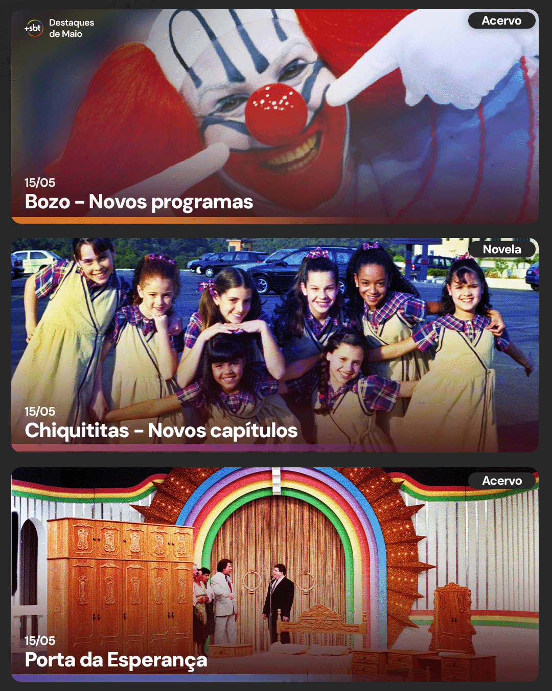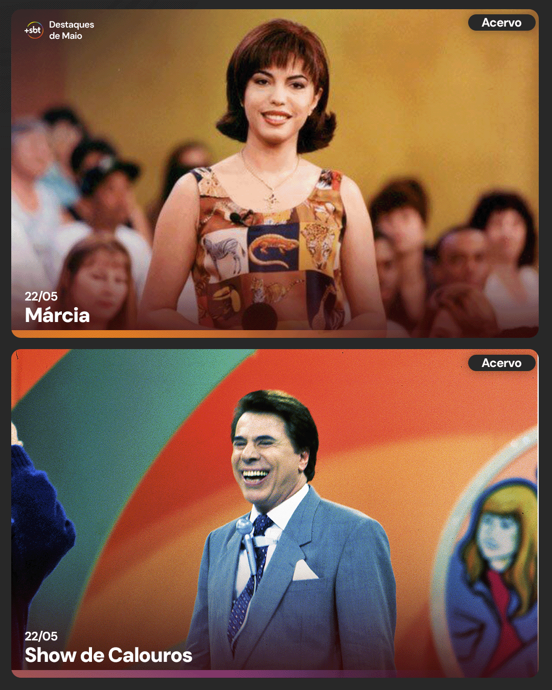 Postado 1 de Maio de 2025 Mai 1 53 minutos atrás, Cleberson disse: Calendário de Maio de 2025 do +SBT Até que enfim começaram entender o que o público quer deles que é justamente o catálogo de programas de acervo, melhor calendário desde que foram lançados. Eles não chegaram a informar que temporadas do Show de Calouros e da Porta da Esperança vão chegar no catálogo? Seria legal se trouxessem alguns programas do Show de Calouros antes de 1985, mesmo que sejam poucos que tenham nos arquivos.